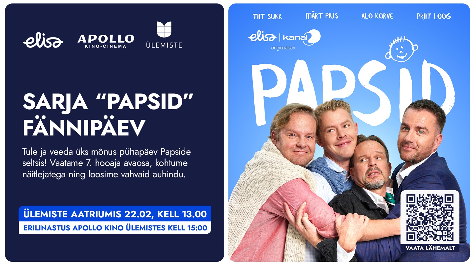 Elisa kutsub kõiki fänne Eesti armastatuima kodumaise komöödiaseriaali "Papsid" tuliuue seitsmenda hooaja erilinastusele. Vaatame üheskoos seitsmenda hooaja avaosa, kohtume näitlejatega ning loosime vahvaid auhindu!